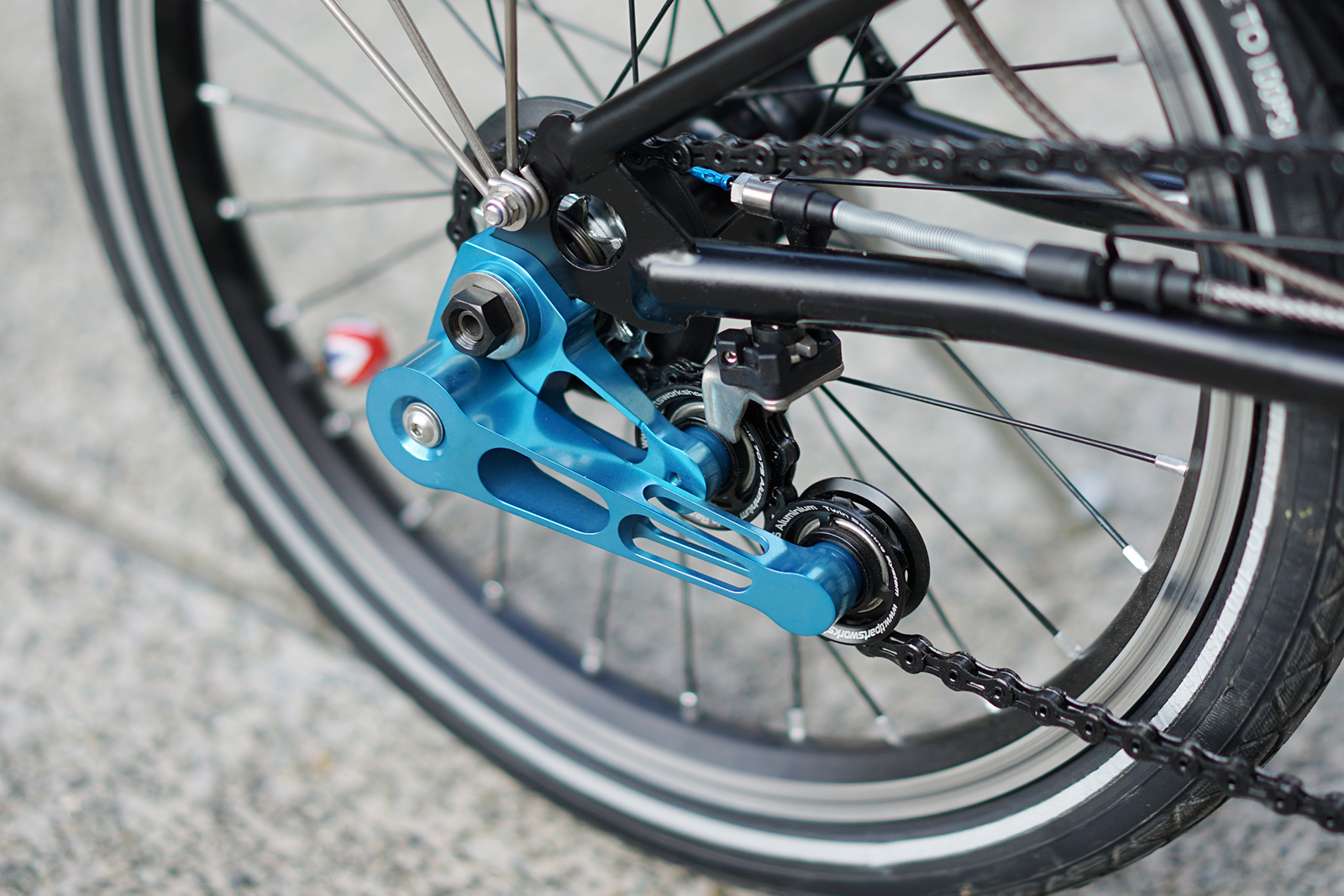Custom color tensioner with TiPart Workshop twin bearings system tensioner wheels.